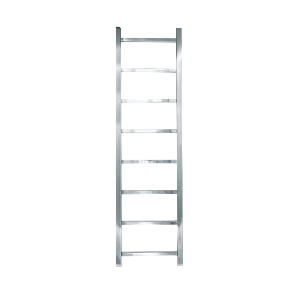 Measuring a height of 1250mm and a slender width of 350mm, this wall-mounted electric towel rail presents a streamlined ladder rail with a robust, squared construction. Both the vertical uprights and the eight horizontal bars showcase angular, squared edges rather than traditional rounded profiles. With a 140mm interval separating each bar, it creates a substantial fixture that harmonises with diverse modern bathroom schemes, particularly enhanced by its polished stainless steel finish that gleams with brilliant mirror-like clarity.