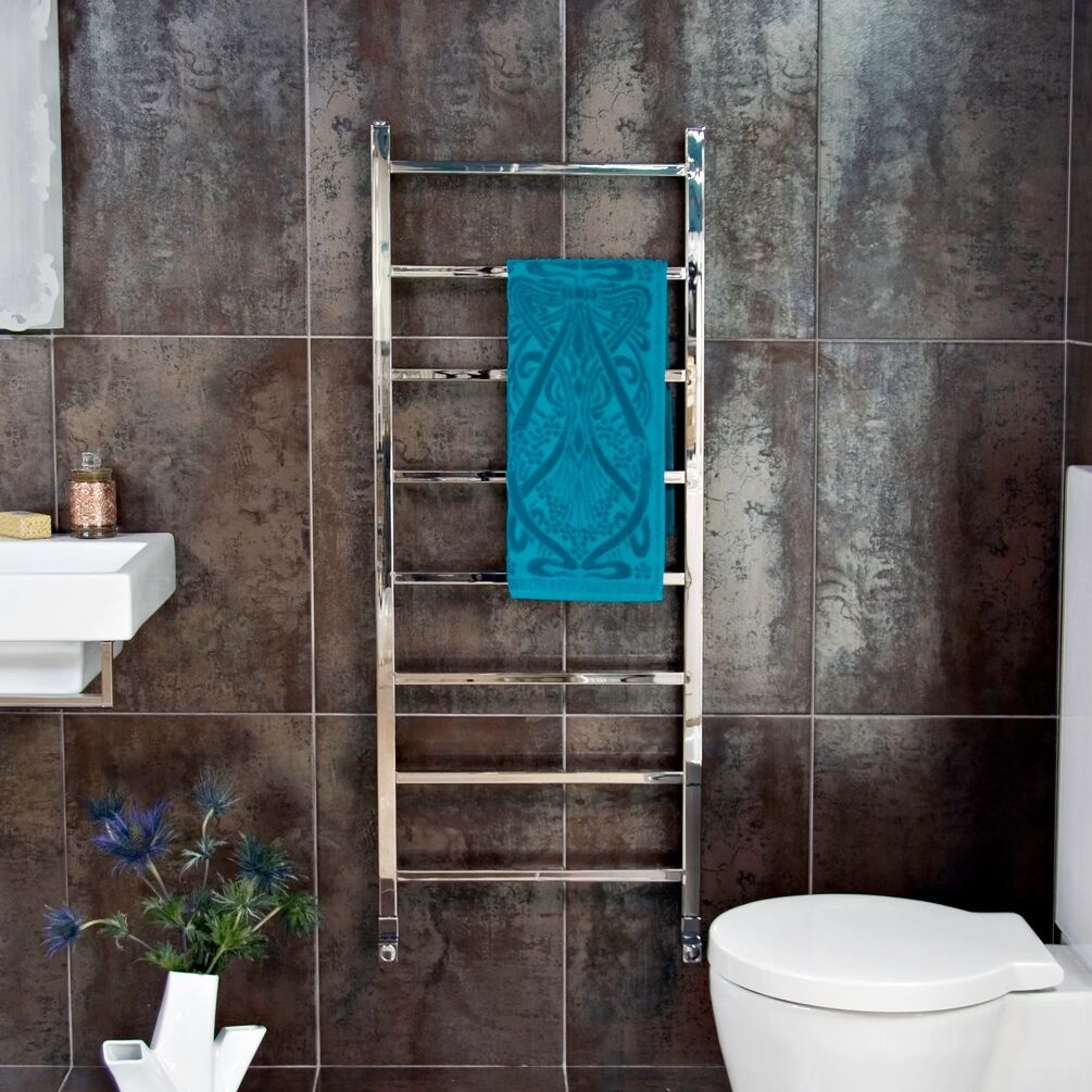 Measuring 1250mm in height and spanning a practical 520mm in width, this wall-mounted heated towel rail showcases a stylish ladder rail with durable, squared construction. The vertical uprights, along with the eight horizontal bars, feature angular, squared edges rather than the traditional rounded shapes. With 140mm of space between each bar, it creates an impressive fixture that enhances various modern bathroom styles, particularly when matched with its polished stainless steel finish, which generates a brilliant reflective effect.