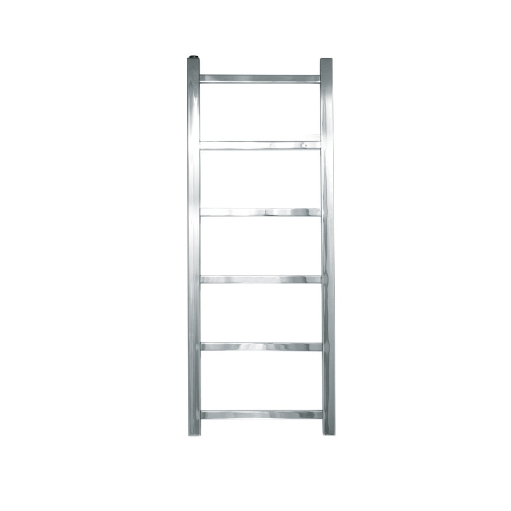 With a length of 900mm and a practical width of 350mm, this wall-mounted heated towel rail showcases a sleek ladder rail design with a solid, squared profile; compact enough to be effective in en-suites and cloakrooms. The vertical uprights and the six horizontal bars all exhibit sharp, squared edges rather than the typical rounded form. Featuring a 140mm space between each bar, it creates a robust fixture that enhances a variety of modern bathrooms, particularly due to its polished stainless steel finish, which gleams with a mirror-like brightness.