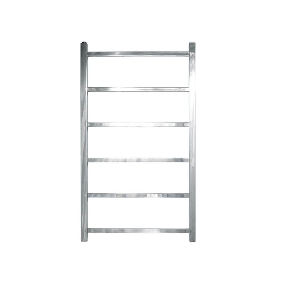 Measuring 900mm in length and a convenient 520mm in width, this wall-mounted heated towel rail supplies a modern ladder rail design with a solid, squared profile; it is compact enough for practical use in en-suites and cloakrooms. The vertical uprights and the six horizontal bars all display sharp, squared edges instead of the usual rounded shapes. With 140mm of space between each bar, it forms a sturdy fixture that enhances a variety of contemporary bathrooms, especially due to its polished stainless steel finish, which shines with a mirror-like lustre.