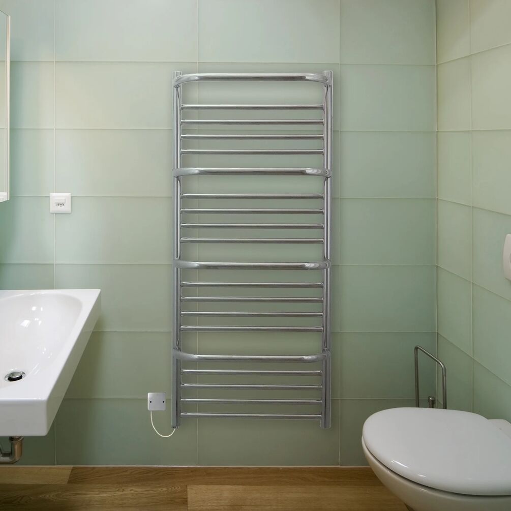Standing at an impressive 1210mm in height and spanning 540mm in width, this wall-mounted electric towel rail presents a distinctive hybrid design that combines traditional flat ladder-rail construction with four strategically positioned curved bars that sweep boldly outward, extending 110mm beyond the central rail plane. The result is a superior towel rail that accommodates significantly more towels than its footprint suggests, with the curved bars providing premier drying positions that benefit from maximum airflow exposure, whilst the rear straight bars offer supplementary capacity. Finished in polished stainless steel, it serves as a steadfast fixture that instantly captures attention.