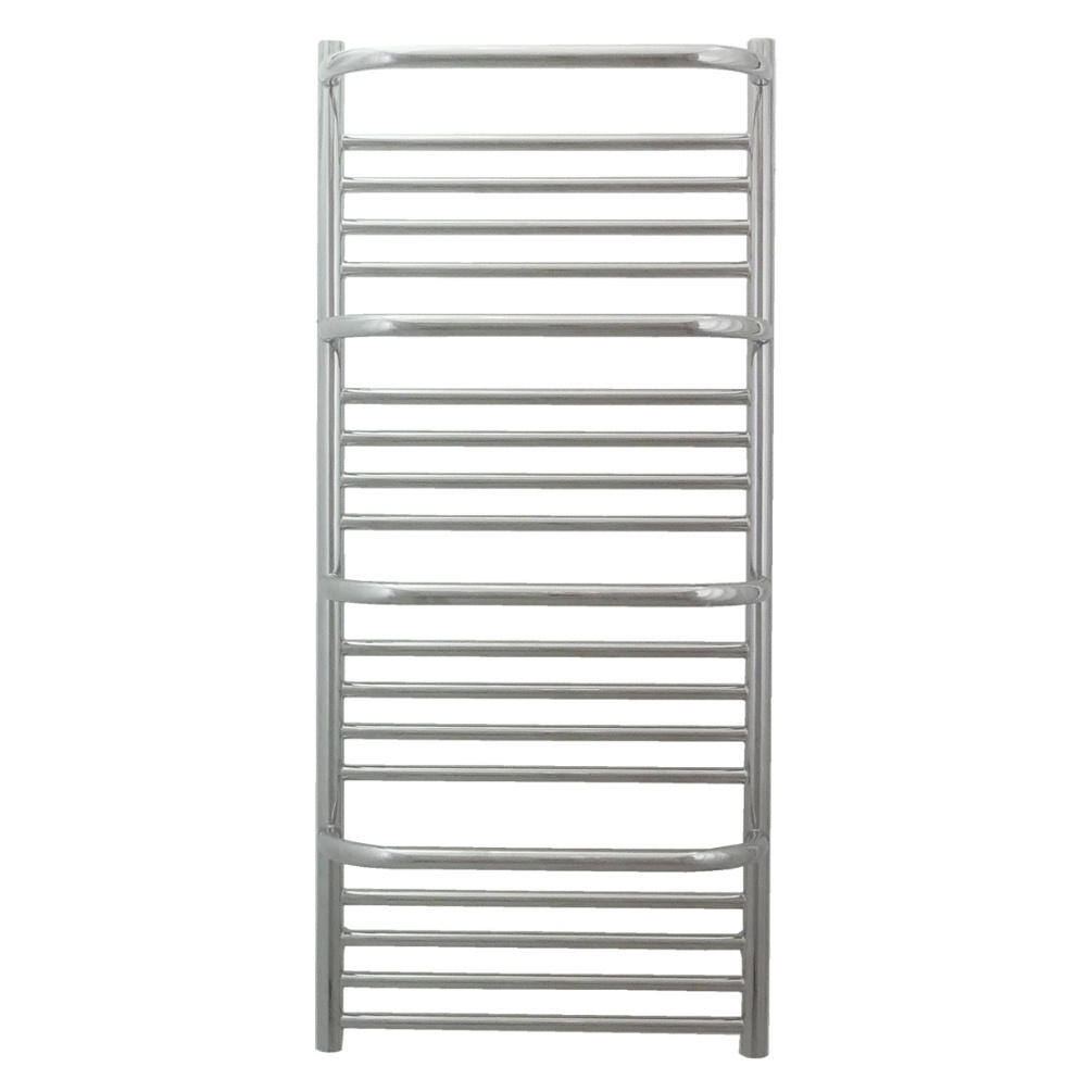 With a height of 1210mm and a width of 540mm, this wall-mounted heated towel rail showcases a distinctive hybrid style that fuses traditional flat ladder-rail design with four strategically placed curved bars that extend outward, reaching 110mm beyond the rail. This results in a superior towel rail that holds considerably more towels than its size would imply, with the curved bars providing optimal drying positions that benefit from maximum air circulation, while the straight bars at the back offer additional capacity. Finished in polished stainless steel, it stands as a robust fixture that effortlessly attracts attention.