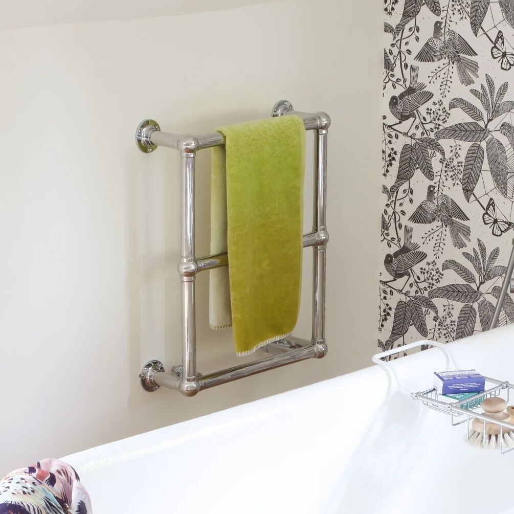 This wall-fixed heated towel rail presents a graceful period aesthetic through its gently contoured tube sections, culminating in a ladder-style configuration of three horizontal rails connected at each junction by recognisable elbow joints. Offering a space-conscious footprint at just 635mm in length and 520mm in width, the generous 240mm gap between rails creates versatile hanging capacity for larger bath sheets, guest towels, and accessories alike. Crafted entirely from premium polished stainless steel with a lustrous reflective surface, this design unites the enduring charm of heritage radiator styling with the gleaming brilliance that only stainless steel can deliver.