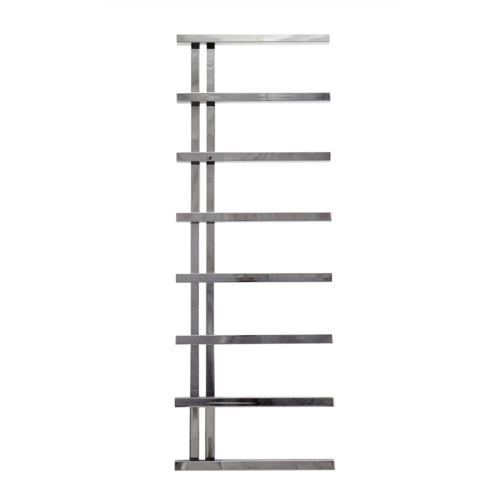 Elevating to a height of 1400mm and extending 500mm across, this wall-mounted heated towel rail introduces a notable departure from traditional ladder rail design with its refined open-ended, side-arm configuration. The structure utilises eight substantial horizontal bars with a crisp, square profile, all anchored to a pair of vertical supports that sit behind the arms. Each arm maintains 165mm spacing from the others, creating an exceptionally effective tiered hanging arrangement that enables organisation, optimal drying, and rapid access to multiple large-format towels. Every element showcases premium polished stainless steel construction with brilliant, mirror-bright luminosity.