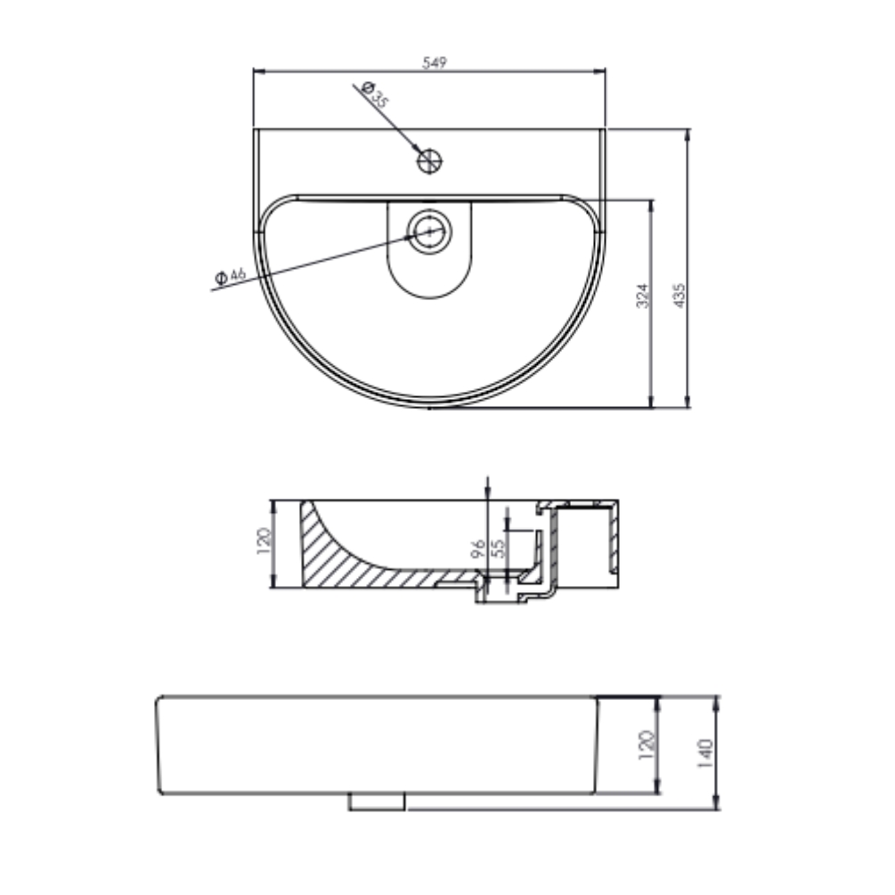 Atop this pedestal sink sits a beautifully simple curved basin. With dimensions of 550mm in width and 420mm in depth from the wall, it takes on a semi-circular shape, characterised by a slender 8mm rim that gracefully curves around, creating a 55mm deep area perfect for handwashing. Designed with your convenience in mind, the basin features a central single tap hole located in the shelf space at the back, allowing you to display your favourite basin mixer tap easily. Additionally, it incorporates an overflow system that effectively prevents spills, ensuring a mess-free experience.