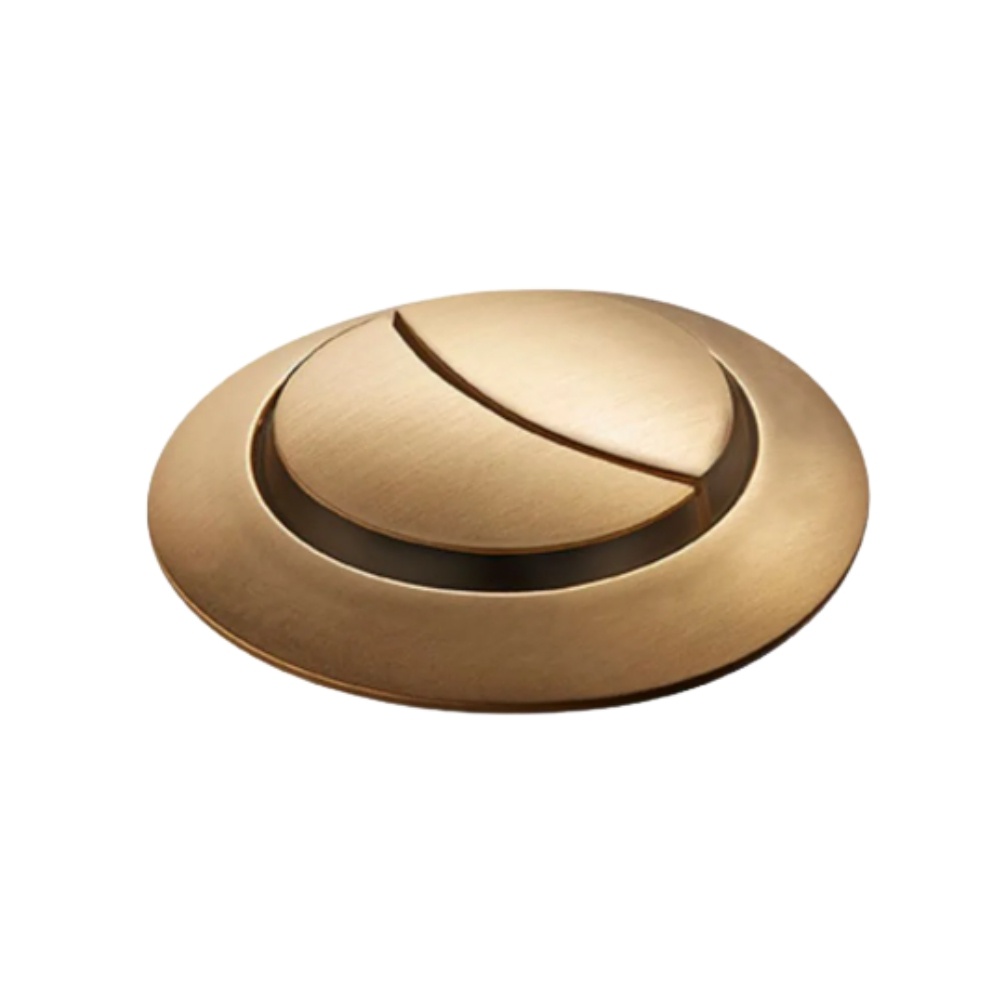 Specifically crafted for the tops of Tavistock's Orbit, Structure, and Lansdown cisterns, this toilet flush button features an elegant rounded shape with a protruding button, finished in luxurious brushed brass that gracefully curves upward. A stylish line runs across its surface, clearly indicating the large and small flush options, all aimed at enhancing its eco-friendly dual flush functionality.