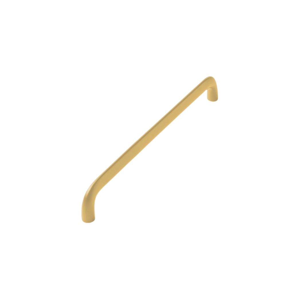 This bathroom furniture handle presents a slim cylindrical bar that rises in a subtle arc between rounded mounting posts, its delicate profile creating an unexpectedly satisfying grip that proves both comfortable and intuitive. The brushed brass finish wraps the slender form in soft metallic radiance, introducing warmth and understated opulence throughout the bathroom environment.