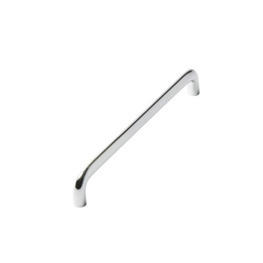 This bathroom furniture handle features a slim cylindrical bar that rises in a subtle arc between rounded mounting posts, its delicate profile creating an unexpectedly satisfying grip that proves both comfortable and intuitive. The polished chrome finish flows seamlessly across the slender form, reflecting light with brilliant clarity whilst maintaining its lustrous presence throughout the bathroom environment.
