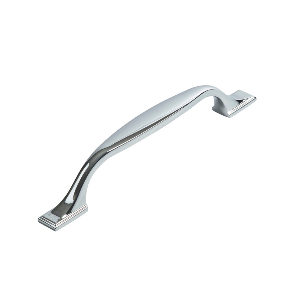 This bathroom furniture handle showcases a beautifully bowed profile that rises in an elegant arch between stepped rectangular mounting plates, each finished with tiered detailing that echoes period craftsmanship. The gentle curve provides natural ergonomic comfort whilst the polished chrome finish delivers brilliant metallic lustre across both the handle bow and decorative backplates, creating a cohesive expression of traditional sophistication.