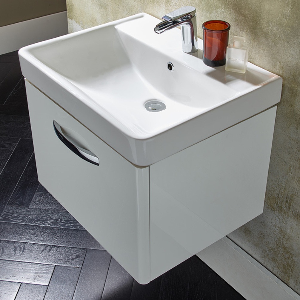 This practical wall hung unit features a soft close drawer that offers plenty of storage space, alongside a single tap hole ceramic basin that would suit any modern bathroom scheme.