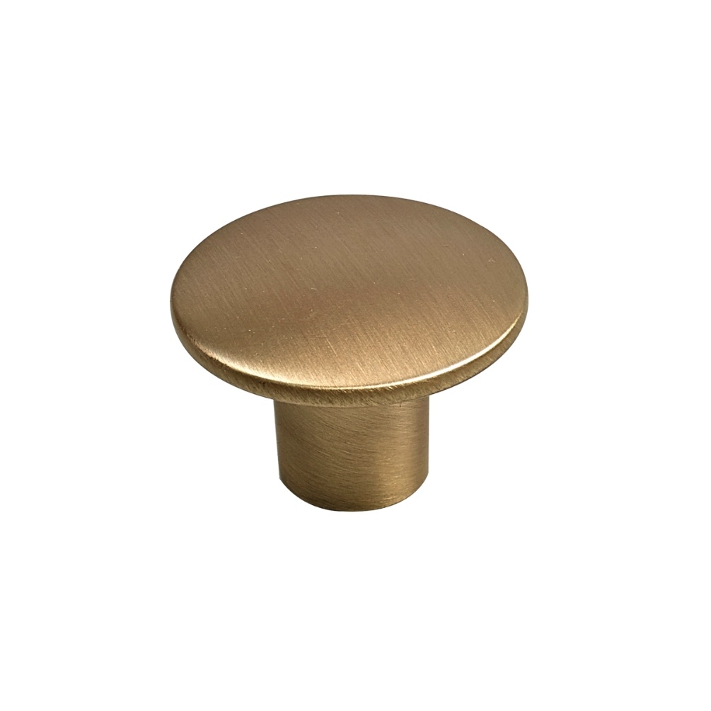 This bathroom furniture handle presents a generously proportioned circular disc that rises from a clean cylindrical base, its smooth planar surface and unadorned geometry delivering confident handling that proves particularly well-suited to pull-out drawers, where reliable grip and intuitive operation remain essential. The brushed brass finish envelops the entire form in soft metallic radiance, introducing warmth and subtle lustre that enriches the bathroom interior with quietly sophisticated appeal.
