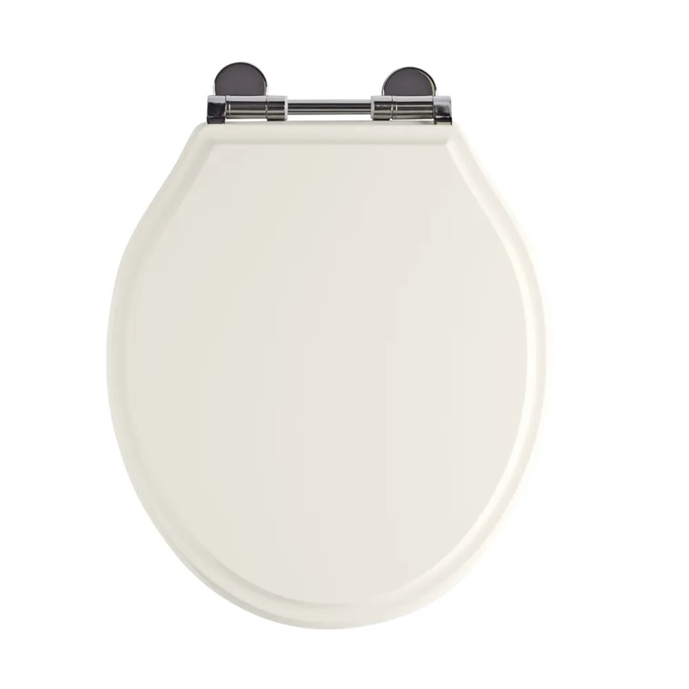 This traditional seat has a rounded shape, which is fixed and fitted with a chrome bar hinge. These are soft-closing ensuring a smooth, quiet closure, and comes with top & under fixings. It is made from MDF and finished in a Linen White polyurethane finish, which is a cream-like shade.