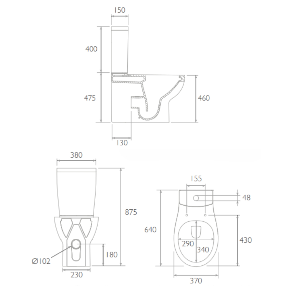 Overall dimensions include a height of 870mm, a width of 370mm, and a depth of 640mm, resulting in a toilet design that optimises space without overpowering other crucial bathroom elements.