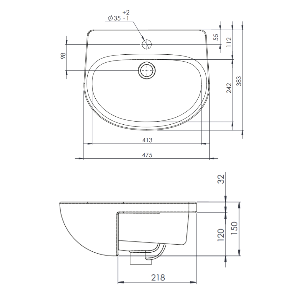 This semi-recessed basin, measuring 475mm in width and 383mm in depth, is designed for partial installation within countertops or vanity units. Its configuration allows for efficient integration of handwashing facilities while optimising storage space in modern bathroom layouts.