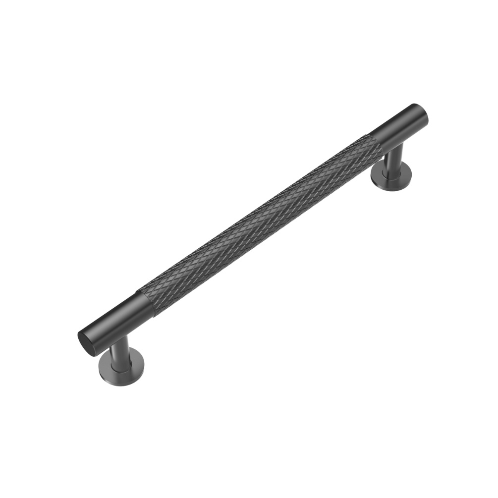 This bathroom furniture handle showcases a cylindrical silhouette enhanced by textured knurling across its central section, delivering both decorative interest and improved grip, while black mounting plates conclude the striking contemporary finish.