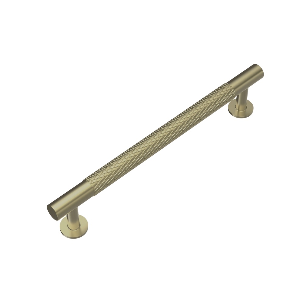 This bathroom furniture handle presents a cylindrical form adorned with textured knurling across its central grip, offering both visual intrigue and superior handling, whilst brushed brass mounting plates conclude the look's luxurious accent.