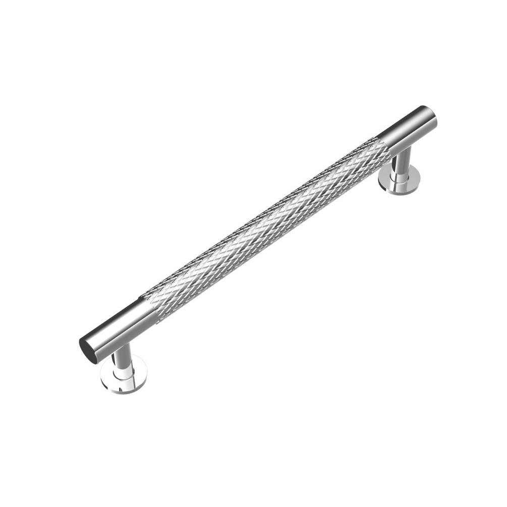 This bathroom furniture handle features a cylindrical profile with distinctive knurled detailing along the central grip, creating visual texture and enhanced handling, while chrome mounting plates complete the flawless metallic lustre.