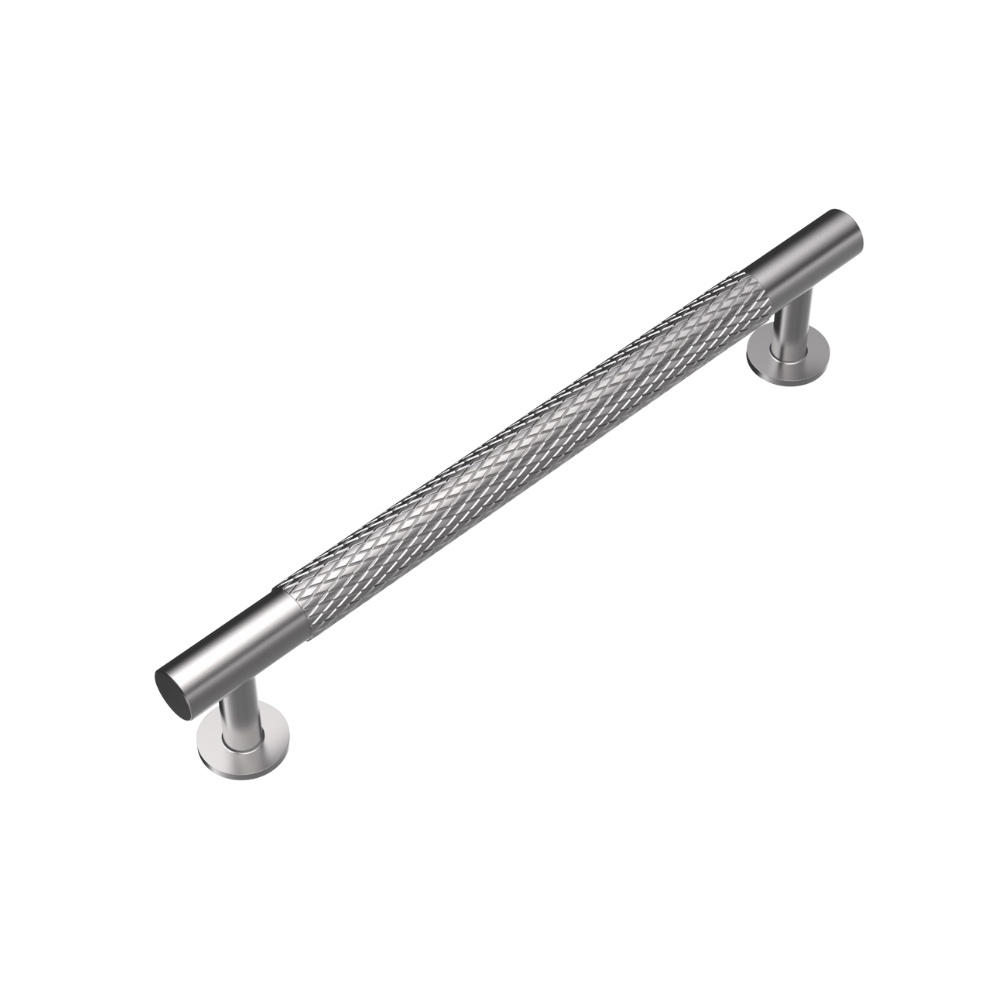This bathroom furniture handle exhibits a sleek cylindrical design enhanced by precision knurling along its central section, providing both decorative depth and ergonomic comfort, whilst gunmetal mounting plates lend a distinctive contemporary edge.