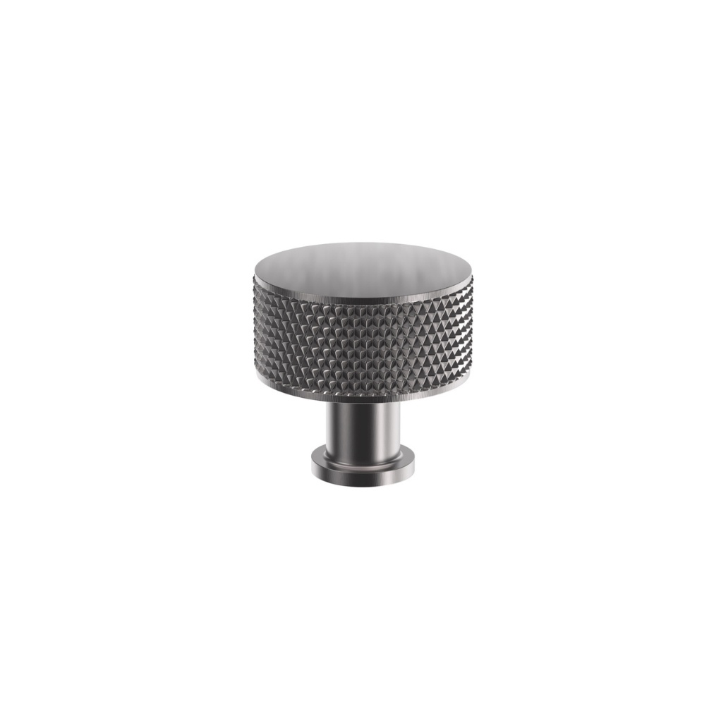 This bathroom furniture handle showcases a substantially proportioned drum silhouette, its elevated cylindrical form adorned with meticulous knurling that wraps seamlessly around the entire perimeter, providing both visual texture and assured handling. Completely finished in gunmetal - a distinct dark grey - it delivers distinctive contemporary depth across every surface, creating a compelling focal point that merges urban edge with understated sophistication.