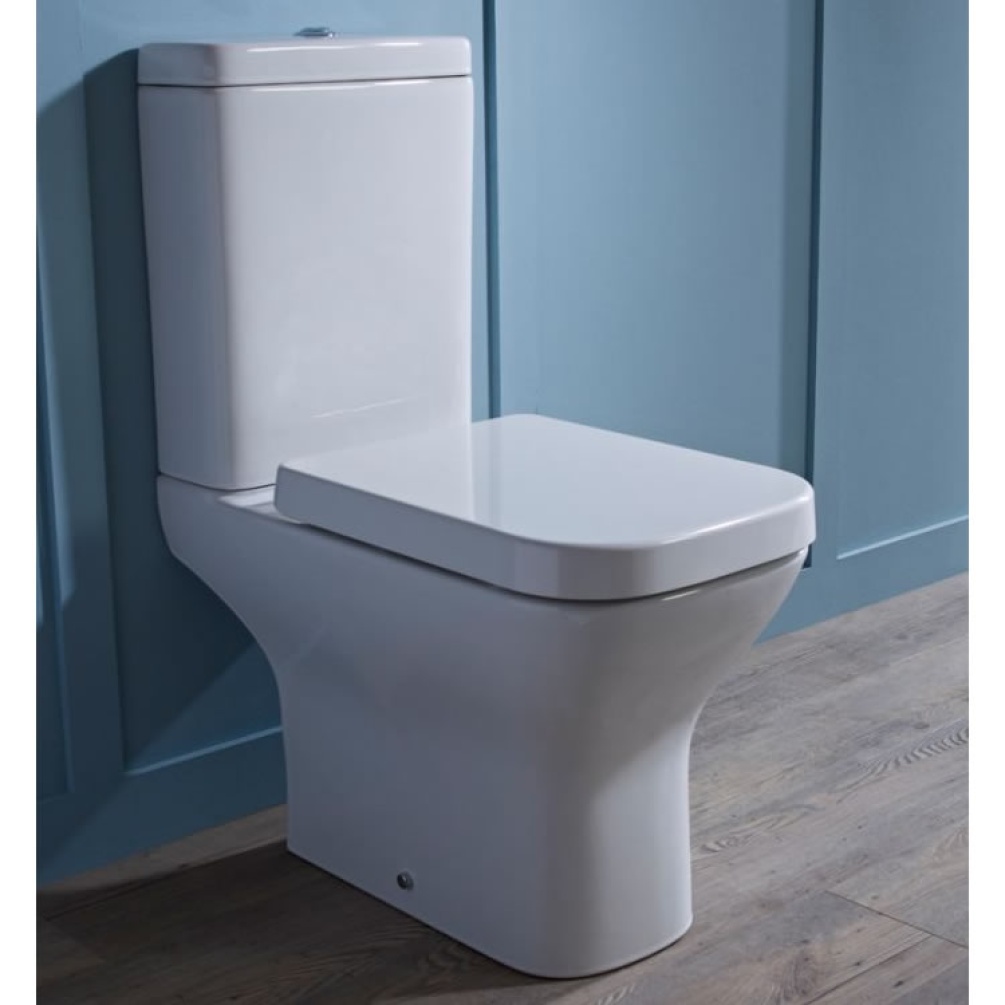 A square theme flows throughout this close-coupled toilet, from its straight pedestal and open back base to the gentle curves that flow upwards to create the square box rim pan, choice of accompanying soft close seat and dual-flush cistern. All components are made from scratch-resistant, pristine white ceramic that is easy to maintain and keep clean.