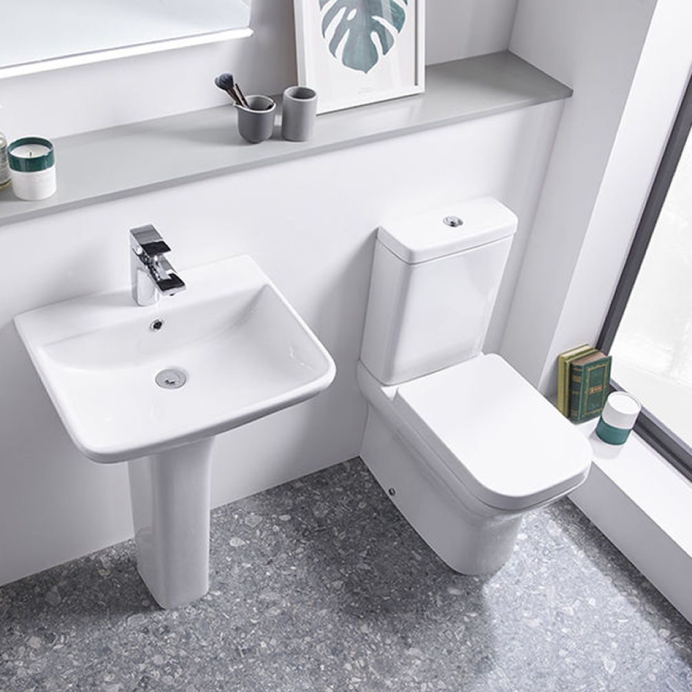 A square design runs consistently through this close-coupled toilet, starting from its straight pedestal that aligns with the wall to the smooth curves that rise to form the square box rim pan, along with the option of a soft close seat and a dual-flush cistern. All parts are constructed from durable, easy-to-clean white ceramic that is resistant to scratches.