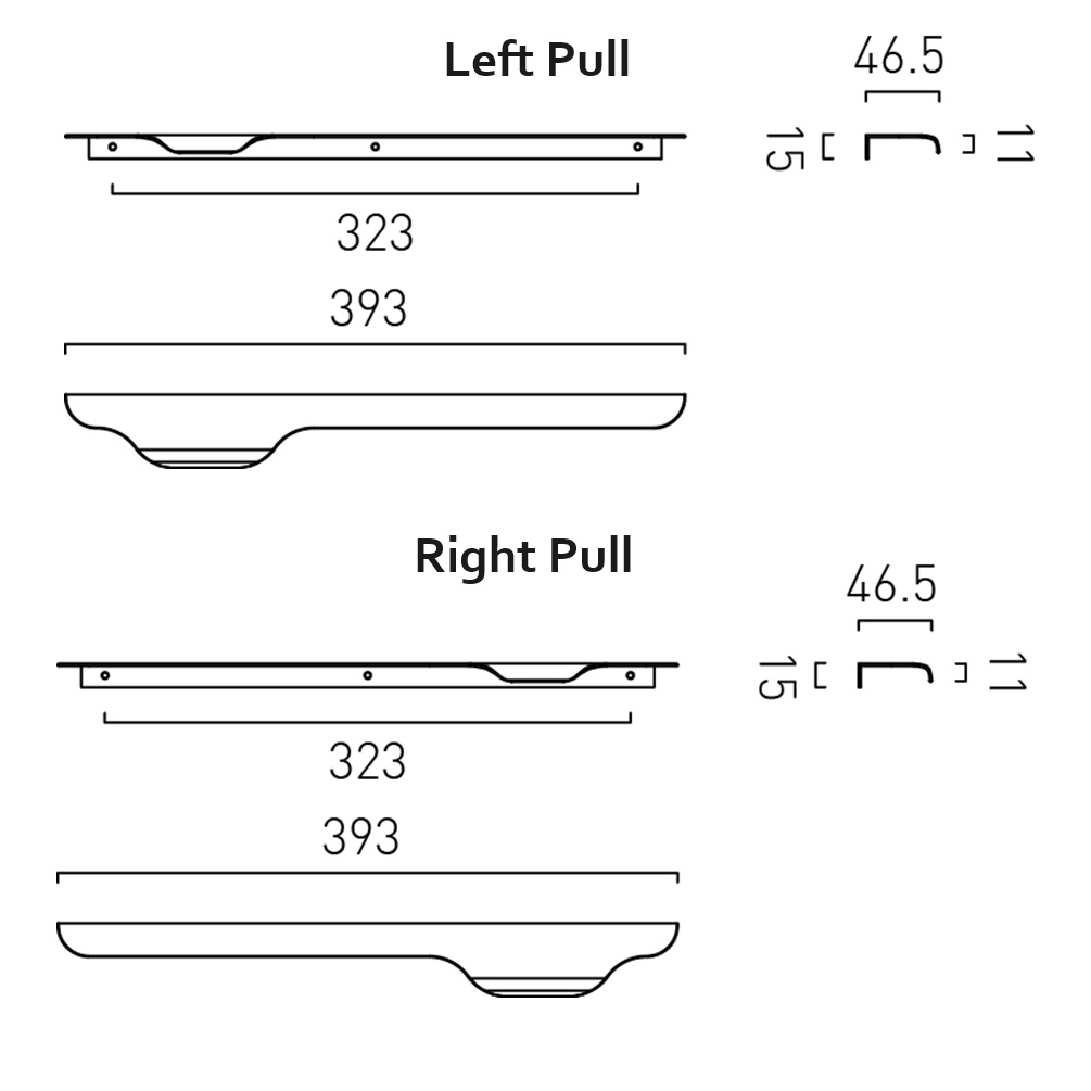 It is installed as a top mount handle, which means it is fixed to the top of the door opening of the vanity unit with the tab-like handle design, that sits three-quarters across the full bar, located furthest away from the hinges. This means that if you are looking to hand the unit with the door hinges on the left, you will need a right pull handle to open and close the unit and vice versa the other direction.