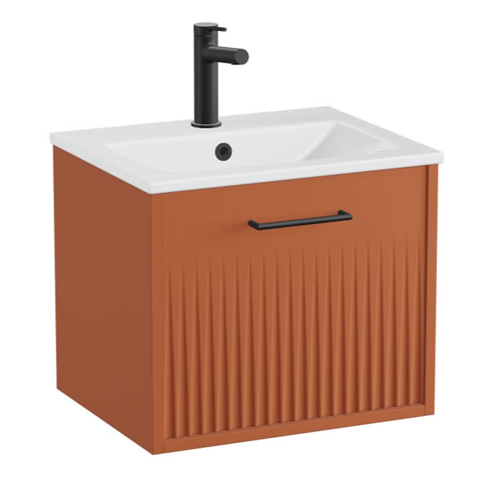 Transform your bathroom into a sanctuary of style and functionality with the Vado Safari Fluted 500mm Terracotta wall hung vanity unit & basin.