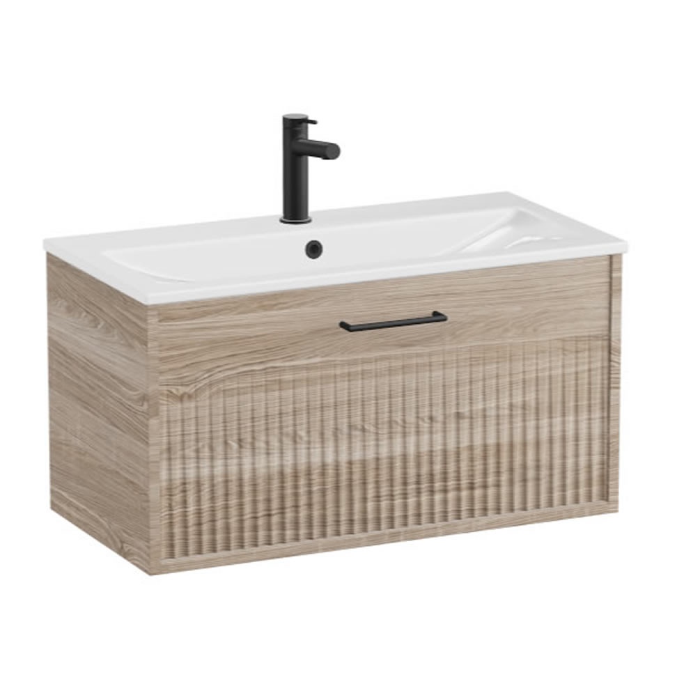 Experience the perfect blend of functionality and beauty with the Vado Safari Fluted 800mm Cashmere wall hung vanity unit & basin.