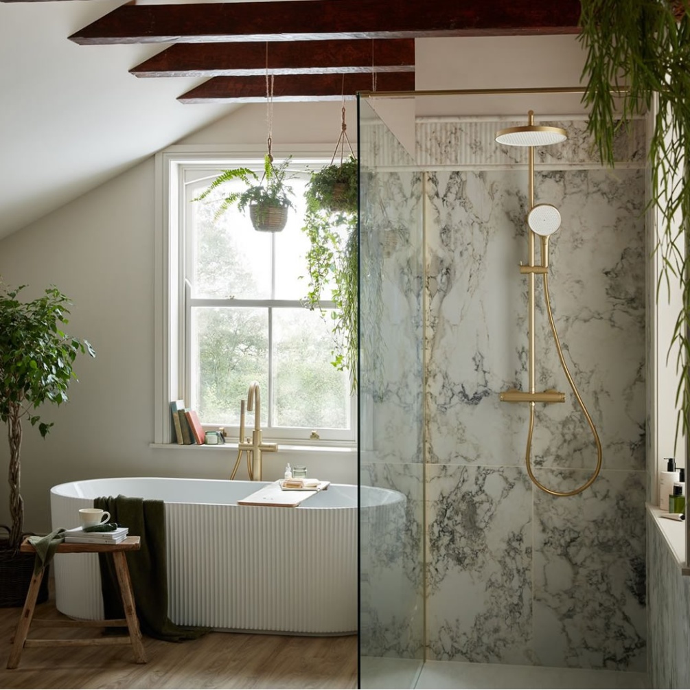 Transform your daily shower experience with the Vado Safari Lever Satin Brass exposed thermostatic shower column.