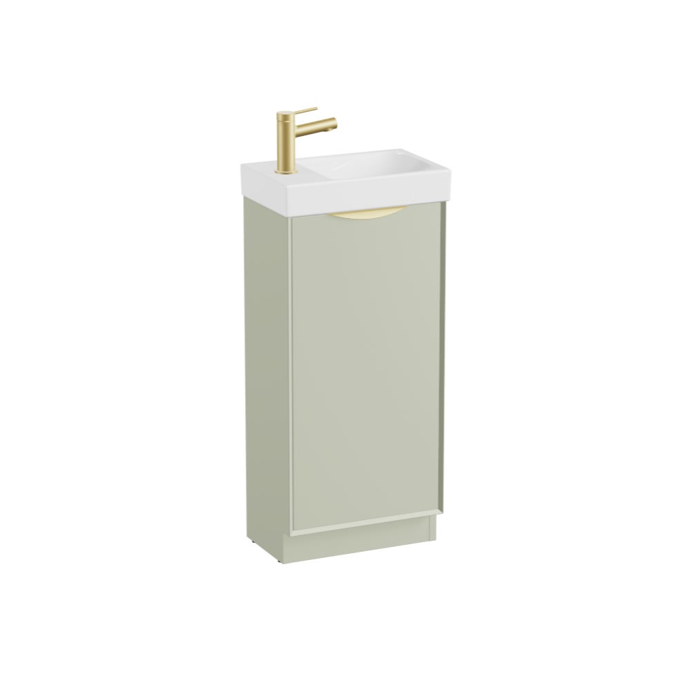 Transform your bathroom into a sanctuary of style and sophistication with the Vado Safari Smooth 400mm Sage Green floor mounted cloakroom vanity unit & basin.