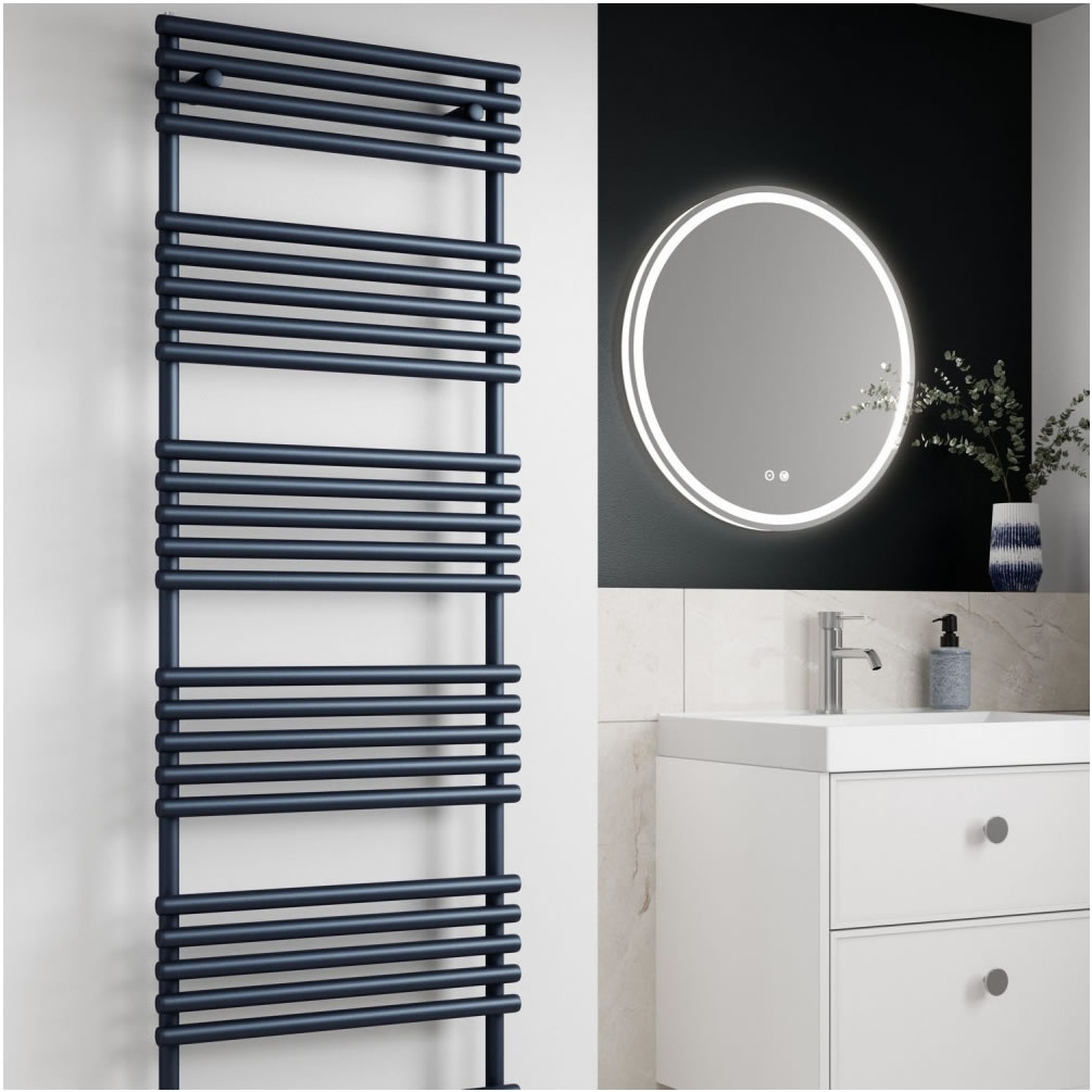 Cloaked in deeply evocative nocturnal tones, the Velaro TT Lux Blue Night towel radiator brings a jolt of striking character surging through your bathroom. This 1355 x 496mm model is ideal for medium-to-large interiors, providing widespread warmth and plenty of towel hanging capacity. In fact, it churns out more than 600 watts of heating power, making the most of its extended ladder-style frame. Better still, with a simple dual fuel upgrade available, you can modify it to run on electricity as well as hot water. This means the radiator can function independently from your central heating system, enabling economical seasonal heating.