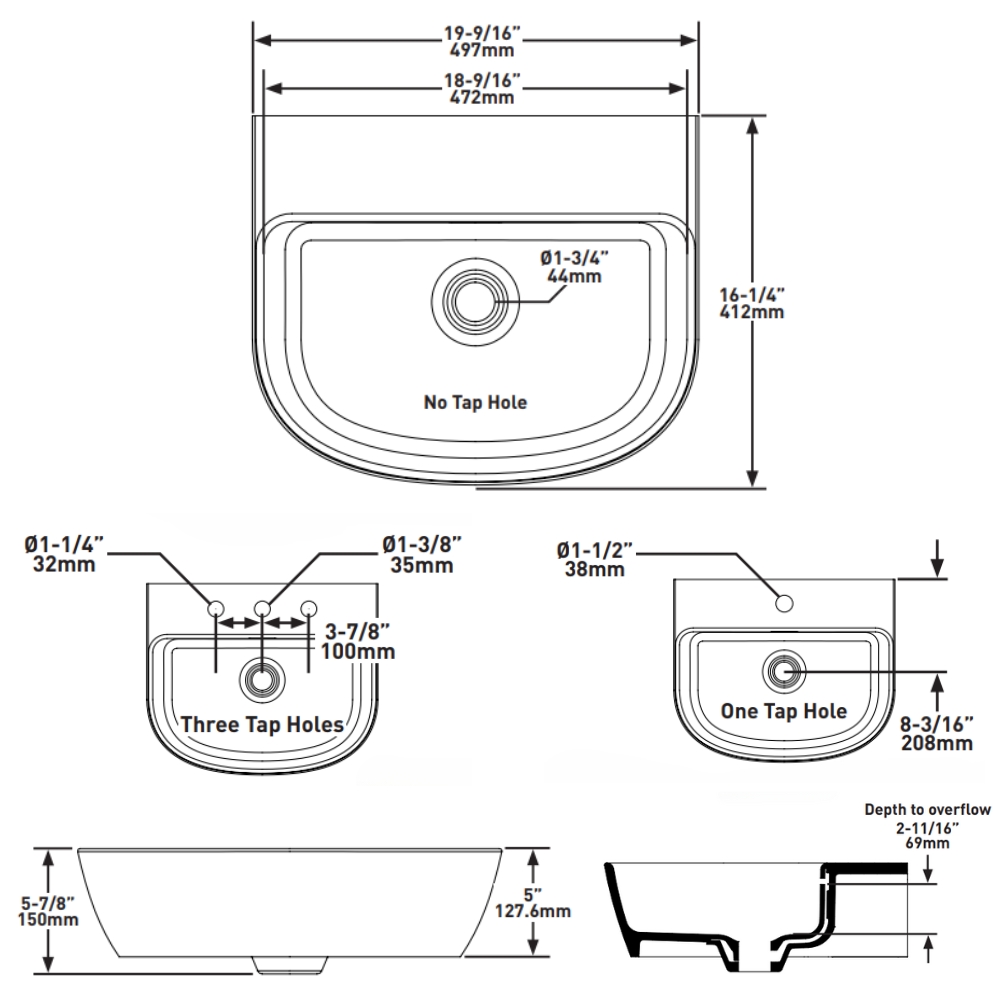 Showcasing a sophisticated D-shaped design that gracefully narrows towards the front with a gently sloping edge, this basin measures 497mm in width, 128mm in height, and 412mm in depth. At the back, a sturdy shelf is crafted to fit snugly against the wall, facilitating a seamless installation and providing a convenient space for organising bathroom items. Alternatively, this area can also serve as a location for a tap. This basin offers the option of having no tap holes, one, or three, providing flexibility for installation with a wall-mounted tap, allowing the shelf area to remain clear, or accommodating a monobloc mixer or a 3-hole basin tap. Please select your desired number of pre-drilled tap holes from the drop-down menu.