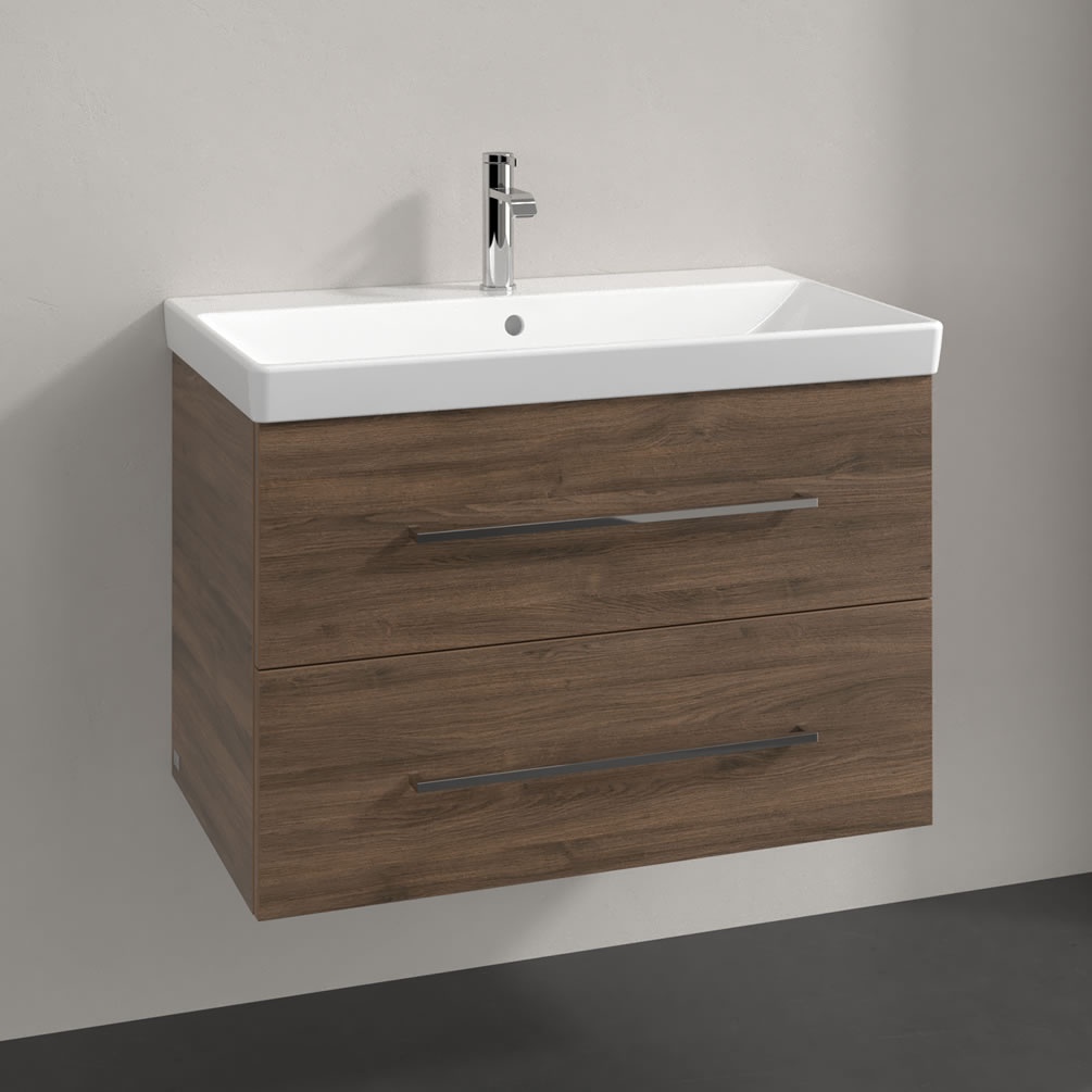 Serving as both storage cabinet and bathroom sink, this practical unit checks two vital boxes in one stylish package. It's presented by Villeroy & Boch, hailing from the stylish and streamlined Avento collection. The cabinet is built from high-quality chipboard with a rich, softly textured oak finish, while the basin is sculpted from glossy and durable sanitary ceramic. This wall-hung unit includes two soft-closing storage drawers, providing plenty of space for your spare towels, toilet rolls and other essential items.