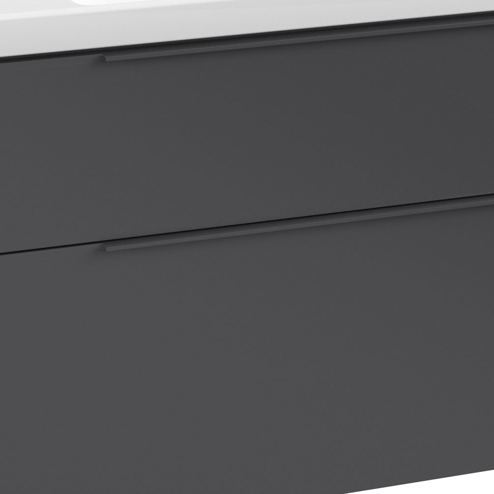With its spacious build and darkly appealing graphite finish, this wall-hung vanity unit is a bold, highly practical bathroom upgrade.