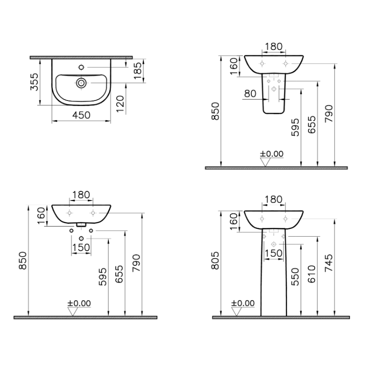 Rounded edges soften the appearance of this rectangular washbasin, which measures 450mm in width and extends 370mm from the wall, relieving its otherwise classic design from being too harsh or angular. Suitable for floor standing or wall mounted installation, this cloakroom washbasin can be paired with either a full pedestal or semi pedestal to achieve the total heights of 790mm and 405mm respectively.