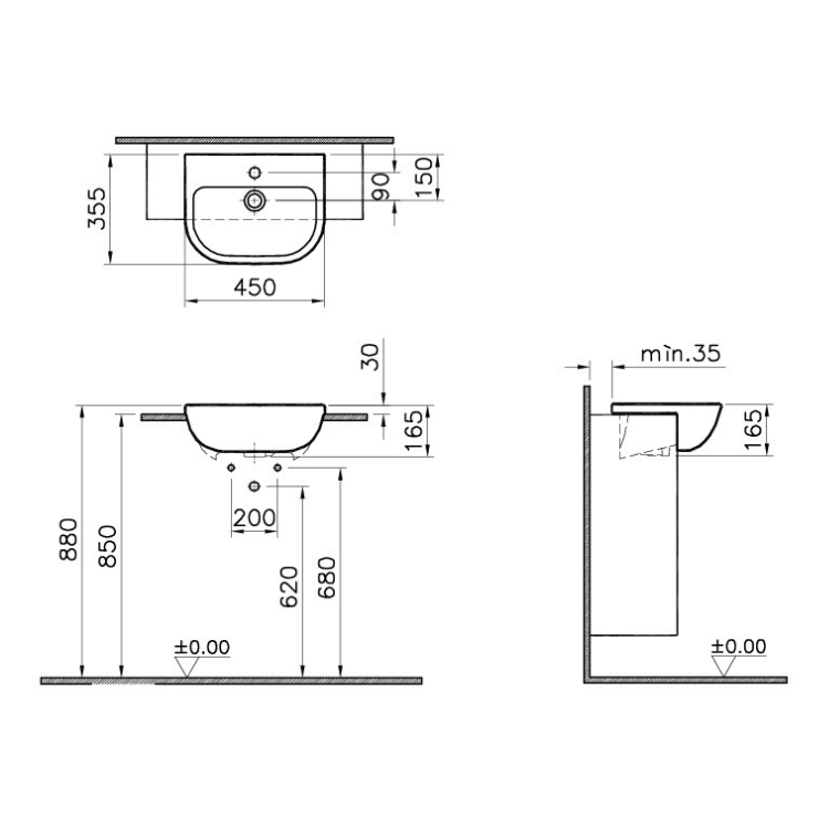 Measuring 450mm in width and 355mm in depth, the rectangular bowl of this semi recessed basin is softened by its rounded edges while its outer edge slopes down to meet the countertop, culminating in its contemporary sculptural design.