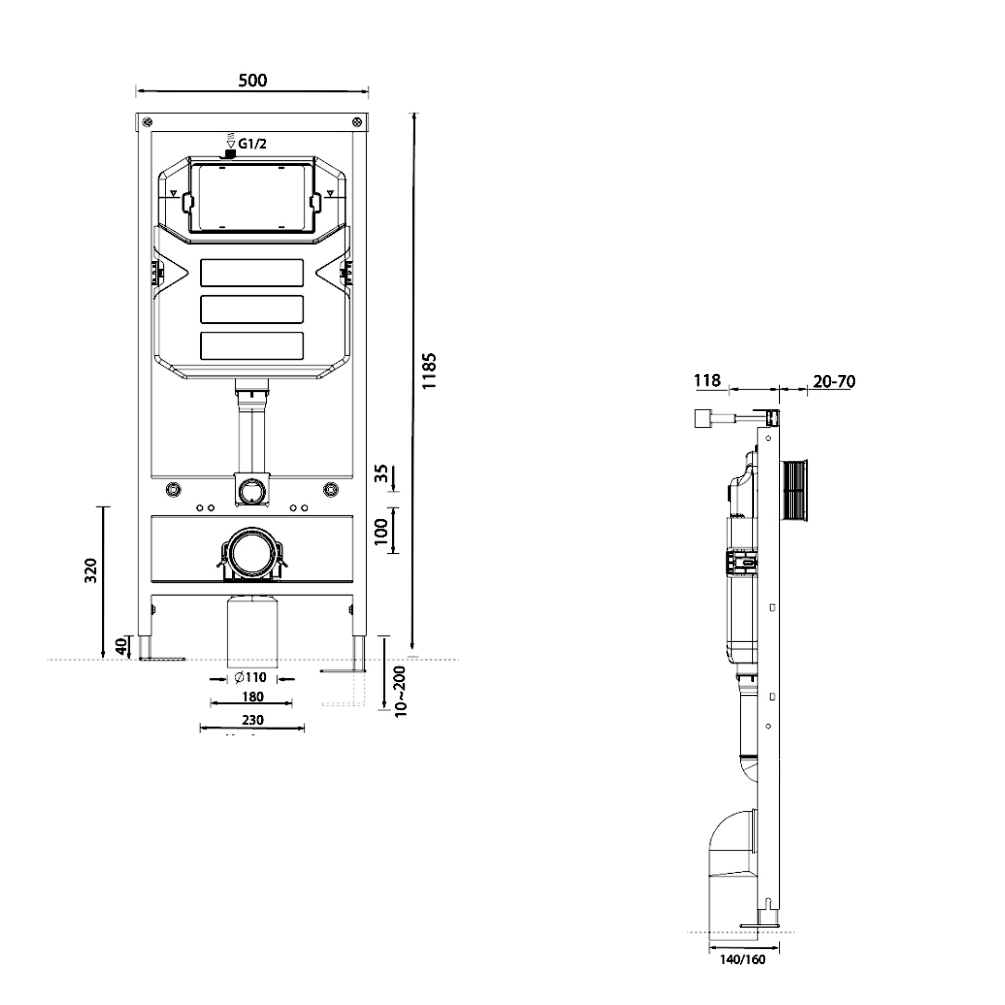 With a height of 1180mm and a compact width of 500mm, this frame is ideal for a range of bathroom layouts—whether spacious, compact or uniquely configured. The frame features height-adjustable feet (0-280mm) equipped with sound-deadening pads, enabling precise customisation to your preferred height and ensuring stable, silent support for your wall hung toilet.