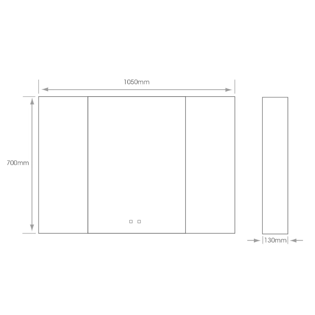 This triple door mirror cabinet, which measures 1050mm in width and 700mm in height, features mirrored panels on the inner and outer facing sides of all three of its doors, such that you can always check your reflection while accessing any part of the cabinet. Additional mirrored surfaces adorn either side of the cabinet, reflecting the surrounding space on your bathroom wall to give it an almost illusory quality, while the outer edges of the cabinet are lined with two substantial strips of colour changing LED lights.